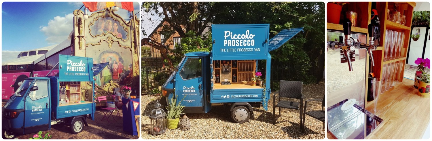 The Piccolo Prosecco Van is an iconic Piaggio Ape, expertly converted into a stunning, one of a kind, mobile prosecco bar serving premium fizz on tap. The van is finished to an unusually high standard and our menu contains several unique prosecco cocktails you won’t find anywhere else! Available for hire for parties, weddings, corporate events and more! When hiring Piccolo Prosecco you can be sure of a stunning van, great drinks, helpful and friendly staff, and great value for money.